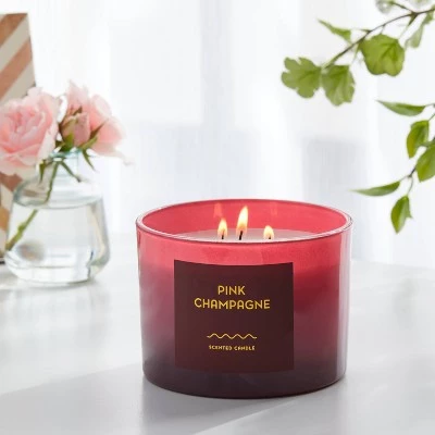 Immerse your space in the luxurious ambiance of the 12oz Ombre Glass Jar with Lid Pink Champagne from Opalhouse™. This candle features a delightful champagne scent with 2 wicks for even, consistent burning. Housed in an elegant glass container, it combines paraffin and palm wax, ensuring a 35-hour burn time. Transform any room with the warm glow and enchanting fragrance of this stylish candle.