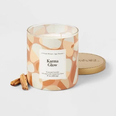 Set the right mood at home with the 2-Wick 15oz Glass Jar Candle with Patterned Sleeve Karma Glow – Opalhouse™. This scented candle comes in a lidded glass jar that lends to a soft ambiance. The Hinoki Cypress and Ocean scent will awaken your senses and give a refreshing vibe. With a burn time of up to 50 hours, you can store this Opalhouse™ 2-Wick 15oz Glass Jar Candle and light it up when you need a well-deserved break.