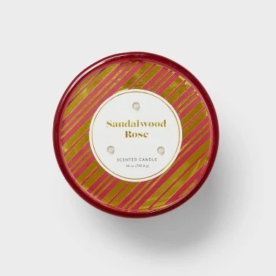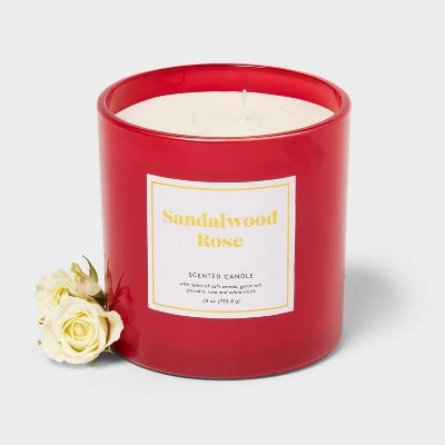 Immerse your space in the captivating blend of sandalwood and rose with this 3-Wick 28oz Glass Jar Sandalwood Rose Candle by Opalhouse™. Crafted with paraffin wax, the candle boasts notes of wood, geranium, jasmine, and white musk. Housed in a sturdy glass container with three wicks, it offers approximately 60 hours of aromatic indulgence, creating a warm and inviting ambiance.