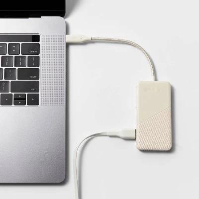 Share videos and data from one device to the other with ease with this USB-C Hub Adapter from heydayâ„¢. This multi-port USB-C Hub Adapter allows you to plug in multiple USB devices and 1 HDMI device all at the same time. If you only have one USB C port on your laptop, that isn’t a problem as this adapter supports up to 60W (20V/3A) power pass through using the USB-C port on the adapter. Organize your cable connections by using the heyday USB-C Hub Adapter that adds style to your desk. In a stone white hue with embossed diagonal striped accents and an off-white and golden braided cable, it’s sure to add a sweet pop of style to your daily tech.
